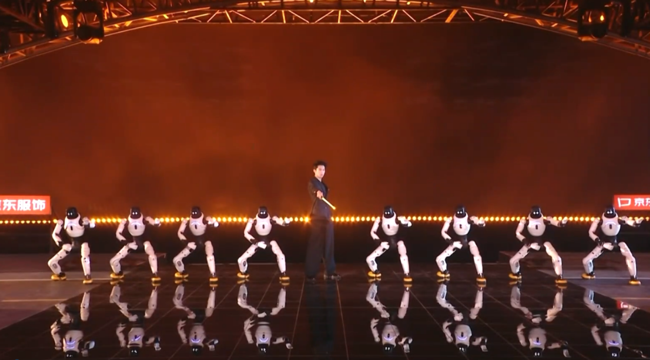 此外,智元機(jī)器人還和王鶴棣共同帶來(lái)節(jié)目《聞機(jī)起武》,伴隨著激昂的《男兒當(dāng)自強(qiáng)》音樂(lè),靈犀X2和王鶴棣炫酷登場(chǎng),隨后8臺(tái)靈犀X2連續(xù)后空翻、前空翻、踢腿、側(cè)空翻等高難度酷炫動(dòng)作輪番上陣:凌厲的踢腿動(dòng)作勁道十足,腿部關(guān)節(jié)發(fā)力精準(zhǔn),盡顯力量感;側(cè)空翻時(shí)軀體旋轉(zhuǎn)角度絲毫不差,與舞臺(tái)燈光交織出極具沖擊力的視覺(jué)效果;前空翻銜接利落;隨后精準(zhǔn)完成連續(xù)后空翻,落地穩(wěn)穩(wěn)當(dāng)當(dāng);氣勢(shì)如虹盡顯機(jī)器人鋼鐵“真男兒”本色。