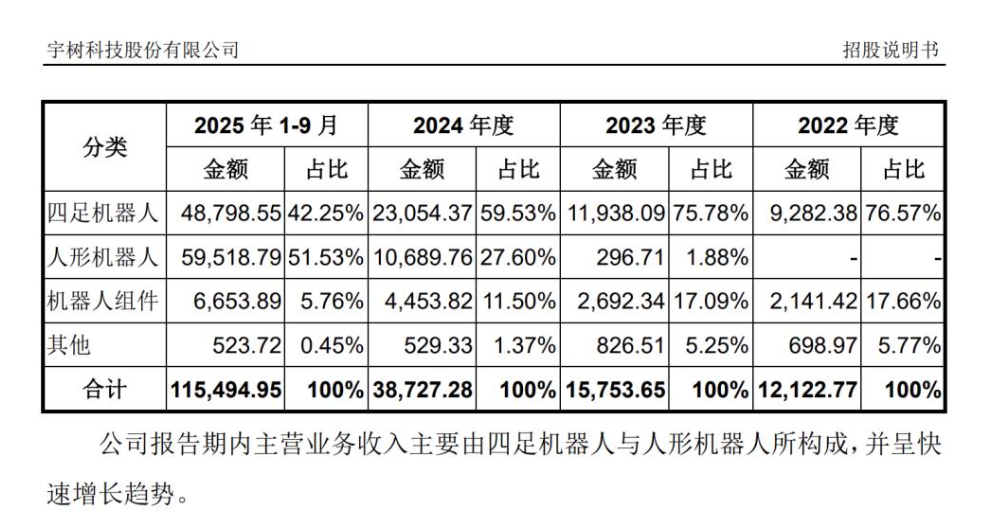 報(bào)告期內(nèi),宇樹(shù)科技主營(yíng)業(yè)務(wù)收入由四足機(jī)器人與人形機(jī)器人所構(gòu)成。2022年、2023年、2024年以及2025年1—9月,四足機(jī)器人收入占比逐步下降,從76.57%降至42.25%,人形機(jī)器人收入占比逐步提升,從2023年占比1.88%,到2025年1—9月達(dá)到51.53%。