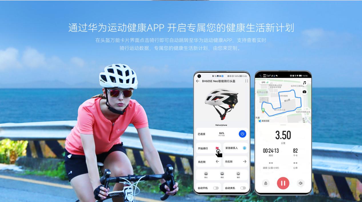 這兩款智能頭盔都支持鴻蒙極簡(jiǎn)一碰連,打開(kāi)手機(jī)NFC和藍(lán)牙,碰一碰頭盔NFC標(biāo)記處即可立刻連接頭盔,輕松開(kāi)啟智能騎行模式。在鴻蒙極簡(jiǎn)應(yīng)用中,點(diǎn)擊騎行將自動(dòng)跳轉(zhuǎn)至華為運(yùn)動(dòng)健康A(chǔ)PP,可查看實(shí)時(shí)騎行運(yùn)動(dòng)數(shù)據(jù),包含軌跡、速度、時(shí)間、消耗熱量等,專(zhuān)屬用戶(hù)的健康生活新計(jì)劃,亦可由用戶(hù)親自定制。
