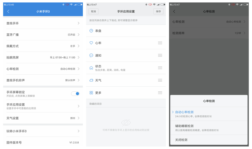 通過(guò)“小米運(yùn)動(dòng)”APP,可以對(duì)手環(huán)進(jìn)行多種個(gè)性化的設(shè)置,可以根據(jù)自己的使用需要來(lái)打開(kāi)/關(guān)閉各種功能:左右手佩戴、抬腕亮屏的時(shí)間段、心率檢測(cè)是否開(kāi)啟、天氣等等都可以自由來(lái)設(shè)置。