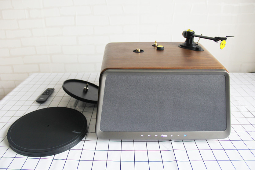 安裝完畢,來看看它的樣貌。通常,黑膠唱機(jī)都是體積龐大,除了唱機(jī)外還需要準(zhǔn)備唱放以及獨(dú)立喇叭。但,HYM團(tuán)隊(duì)把黑膠唱機(jī)和智能音響融合到了一起:智能音響造型采用翻轉(zhuǎn)曲木設(shè)計(jì),大膽前衛(wèi)。