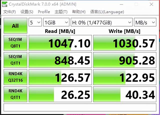 使用 CDM 軟件跑個分看看,讀寫都達(dá)到了 1GB/S ,與官方宣傳的一致。