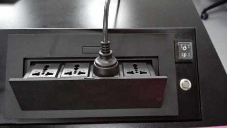 通過圖片我們可以看到,電源的插口被隱藏在桌面上。這種隱藏式臺面插座,既節(jié)約了桌面空間,又提供了多功能的會議多媒體需求。