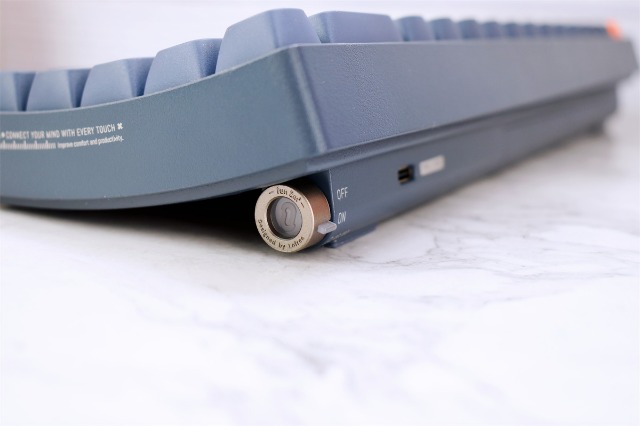 鍵盤的開關(guān)和模式切換都在鍵盤右側(cè)位置,轉(zhuǎn)動旋鈕的設(shè)計非常有創(chuàng)新。撥動這個旋鈕可在有線模式、無線模式中切換。其中“ON”就是有線模式,接上Type-C數(shù)據(jù)線即可使用。