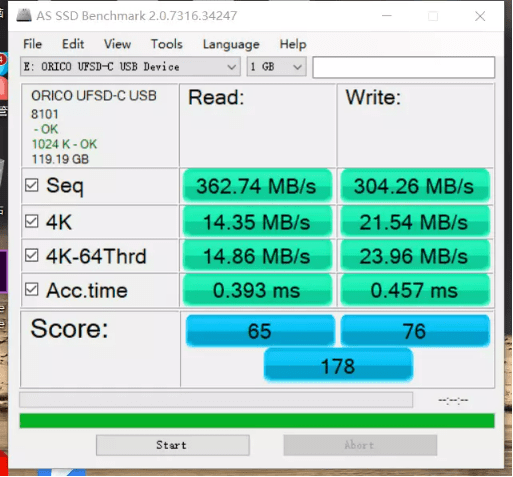 用AS SSD Benchmark測得數(shù)據(jù),讀取速度:362.74MB/s,寫入速度:304.26 MB/s。