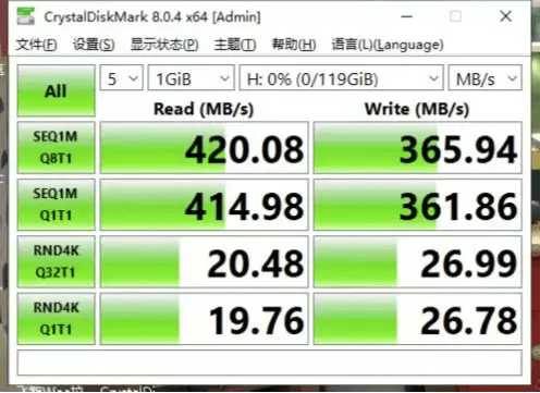 用CrystalDiskMark測得數(shù)據(jù),讀取速度:420.08 MB/s,寫入速度:365.94 MB/s。