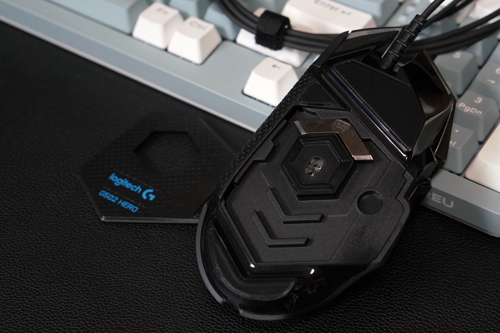 底部配重倉蓋上用藍色字體標明了產品型號,羅技G502 HERO附送了五塊3.6g的配重塊,方便用戶通過配重調節(jié)鼠標重量,以滿足每個人不同的手感差異。