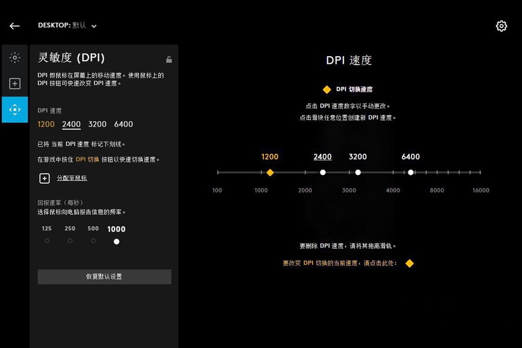 在驅動中的性能界面里,我們可以調整鼠標的DPI、回報率等硬件參數。羅技G502 HERO最高支持5檔DPI調節(jié),最高支持25600 DPI。
