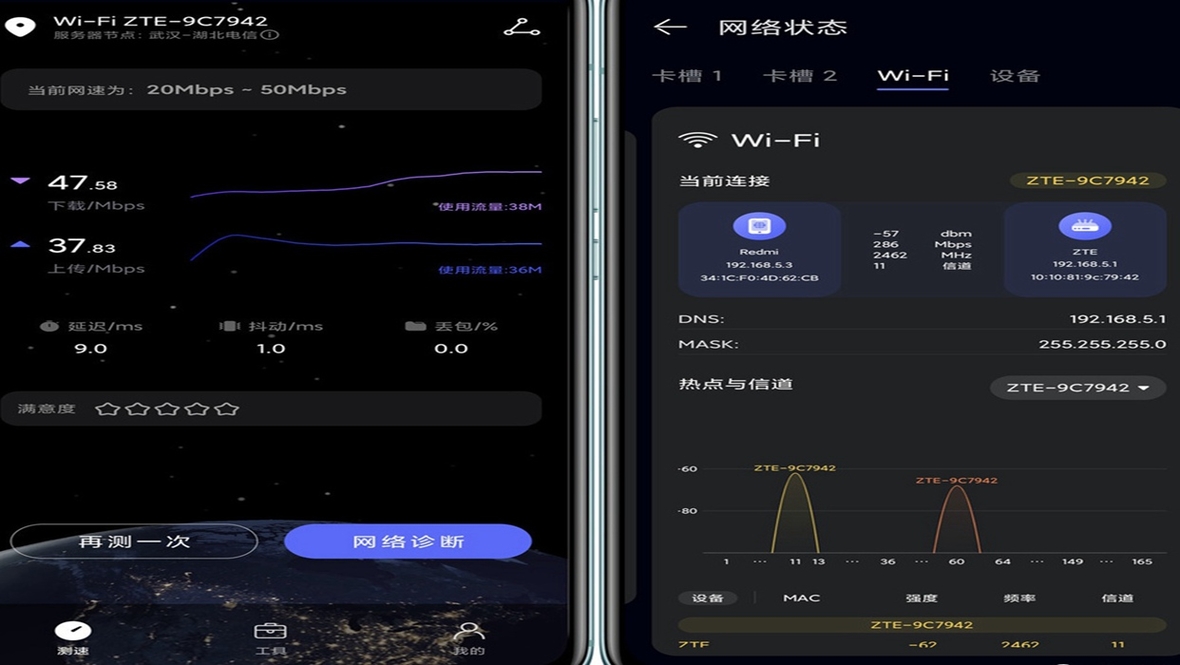 對于復(fù)式用戶來說,多了幾道墻體的阻隔,信號還有保證嗎?將路由器放置在一樓次臥,上樓之后信號依然是滿格,信號強(qiáng)度為-57dbm,下行速度為47Mbps,上行為37Mbps,可見這臺路由器的信號強(qiáng)度和穿墻能力真的很強(qiáng)。
