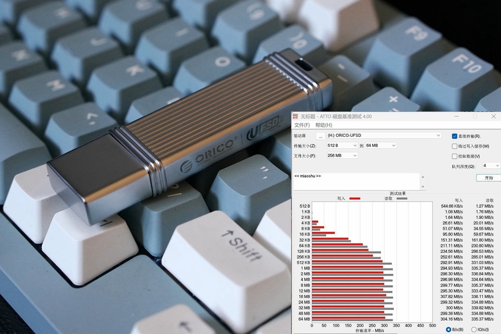 我用來測試的電腦配置是AMD 5600G處理器+B550主板,支持USB3.2 Gen1協(xié)議。使用硬盤測試軟件ATTO對ORICO快閃U盤UFSD-I進(jìn)行讀寫測試,最終結(jié)果寫入速度為304.16MB/s,讀取速度為335.37MB/s,表現(xiàn)超出了我的預(yù)期,給了我十足的驚喜!