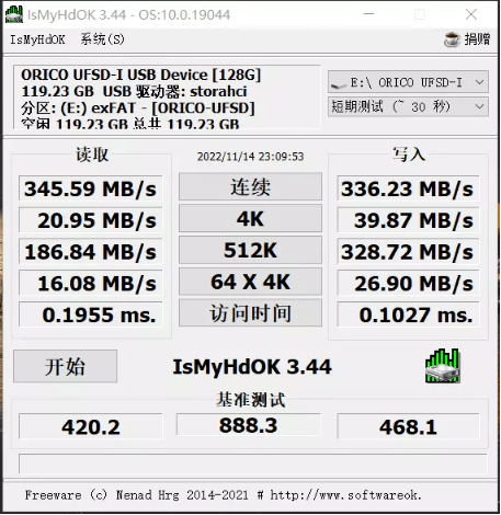 用IsMyHdOK測(cè)得數(shù)據(jù),讀取速度:345.59 MB/s,寫入速度:336.23 MB/s。