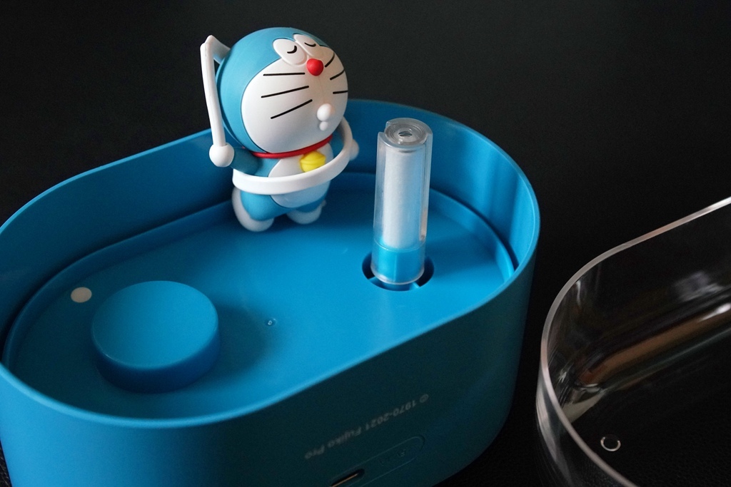 加濕器頂部設(shè)計有一個圓形轉(zhuǎn)盤,可以將哆啦A夢手辦插在上面,手辦做工細膩,完美還原了童年的玩伴--藍胖子。