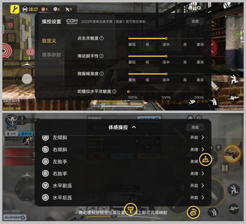 其次,iQOO 11將體勢操控帶入游戲之中,在游戲側(cè)邊欄中,可以呼出“體感操控”選項,通過不同的體勢來進行按鍵映射,實現(xiàn)多維度的操控。比如在《使命召喚手游》中將“水平前壓”設(shè)置為換槍,在游戲時,我們只需要把手機向前“壓”一下,就可以快人一步、輕松換槍,這在關(guān)鍵時刻,絕對可以“救你一命”!而在《王者榮耀》中,我們則可以通過設(shè)置體勢操控來實現(xiàn)抬手喚起“小地圖”、左右傾斜喚起“道具商店”等操作,游戲操控更加高效。