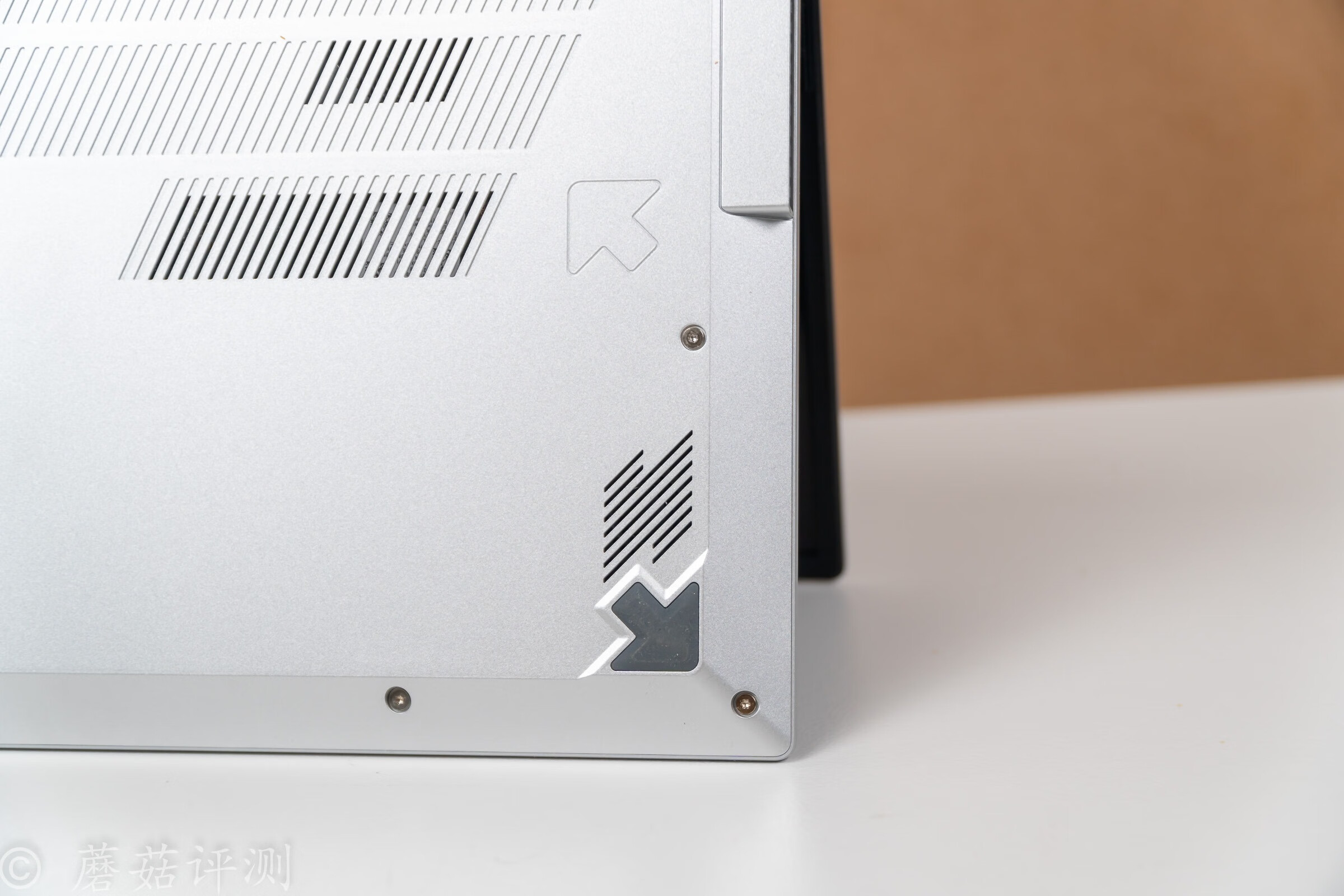 ▼筆記本的D面,設(shè)計(jì)的也很有意思,進(jìn)風(fēng)口放置在特定的位置,保證風(fēng)道通暢,給筆記本內(nèi)部的其他硬件也能提供出色的散熱效果。另外還有很多很有意思的設(shè)計(jì),例如防滑墊,右上角采用了橙色的防滑墊。