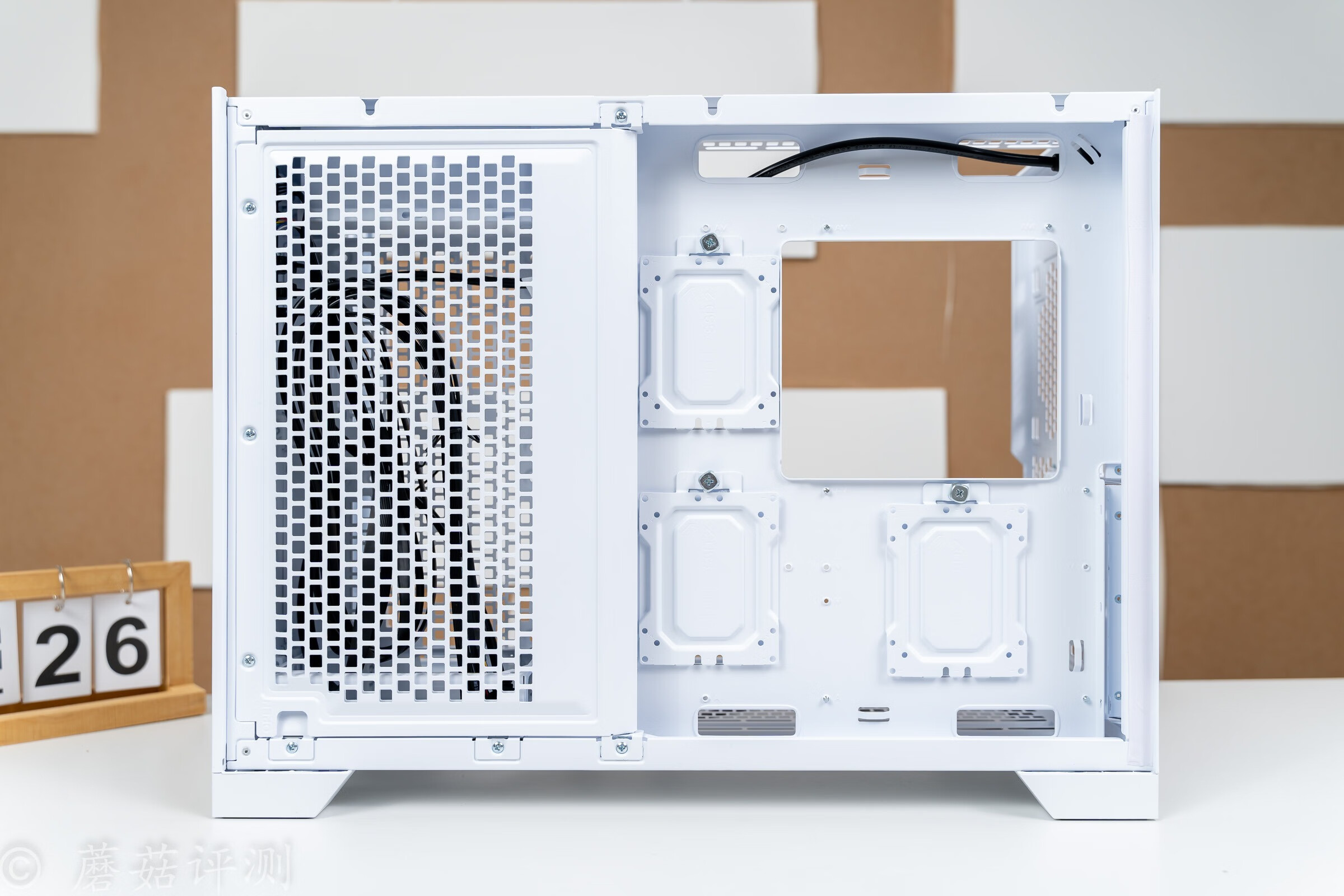 ▼機箱內(nèi)部左側(cè)用于固定主板,最大支持E-ATX規(guī)格,周圍是各種走線開孔。