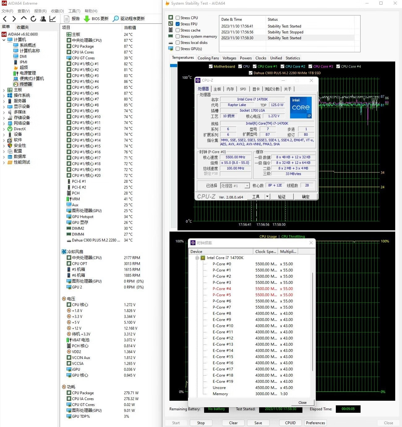 ▼單烤FPU測試,處理器功耗在280W左右,大核心睿頻5.5GHz、小核心睿頻4.3GHz,溫度在87℃左右,整體的散熱情況表現(xiàn)很不錯(cuò)。