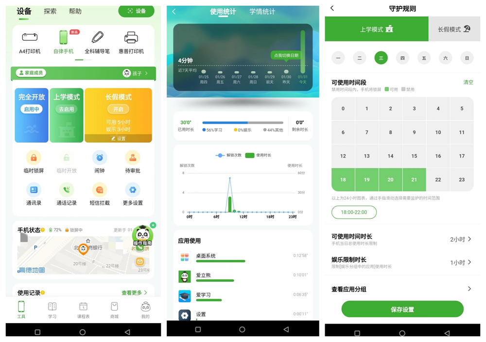 家長端愛立熊APP上有完全開放、上學模式、長假模式三大模式,三大模式下對于自律手機的使用時長時段管控、應用分組管理、App使用報告查看、學情分析等監(jiān)護功能可以靈活管理查看。自律手機的使用時長時段可管控,家長可以和孩子約定“使用時段”以及“娛樂限制時長”,比如手機當日總使用時長限制為5個小時,娛樂分組中應用的使用時長是3小時,讓孩子對自己的時間有規(guī)劃,合理利用時間。