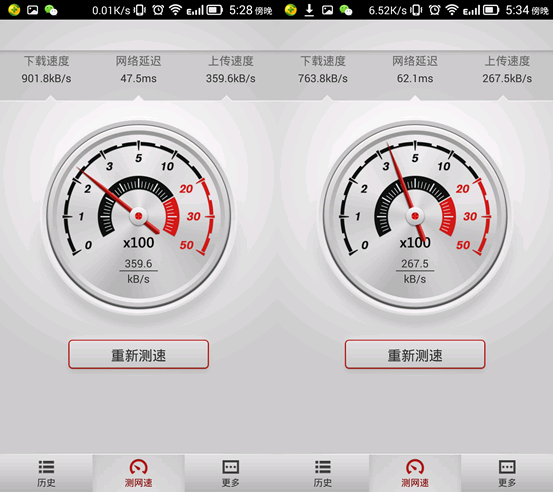 上面分別是距離兩個路由0m、5m和5m(有且非承重墻阻隔)距離的測試結果。右側綠框是NexHome路由的信號,左側綠框是對比聯(lián)想newifi mini的信號??梢奛exHome路由的信號強度與普通智能路由基本持平,盡管在遠距離和穿墻上稍遜一籌,但實測過程中,NexHome路由的信號要想度穩(wěn)定一些。