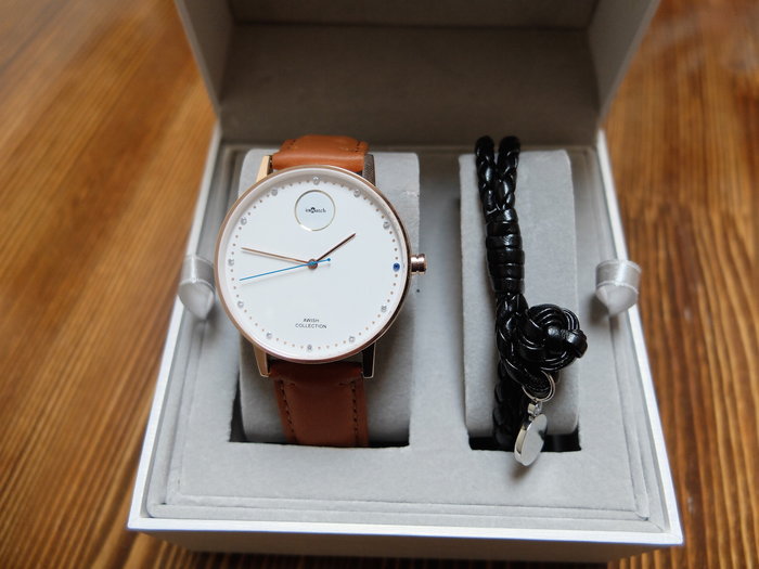 同樣是來自pozible眾籌Aurora是我拿到的第二塊,包裝比起Paick來說大了很多。表盤設(shè)計有38mm和44mm兩個版本,我拿到的是38mm的,女生佩戴也沒有什么問題,44mm的就不適合手腕太小的人了。Aurora的功能更為豐富(功能留到最后統(tǒng)一講),所以它的智能模塊提供7天的續(xù)航時間,需要及時充電。包裝里配備了一個充電底座,可以一個小時快速充電。