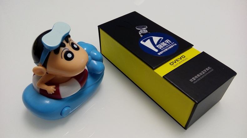 盒子的兩個(gè)側(cè)面是黃色底,上面印有“OVEVO Sport and Music”的反光水印,用手觸摸文字有略微的凸起感。