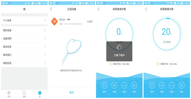 我的模塊內(nèi)查看自己的設(shè)備連接,已連接的設(shè)備有顯示電量的百分比,復(fù)健時(shí)的強(qiáng)度根絕自身需求加強(qiáng)與減弱。APP有指定的時(shí)間,完成時(shí)候后的疼痛感會(huì)明顯減輕不少。