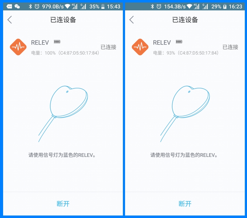 這款悅立H1的APP叫Relev,直接掃描包裝盒上的二維碼或者在較大的應(yīng)用市場上都能搜到。根據(jù)操作指示,連接也很便捷,需要注意的是如果復健儀和其他的手機連接過,要斷開連接才能與新手機連接。