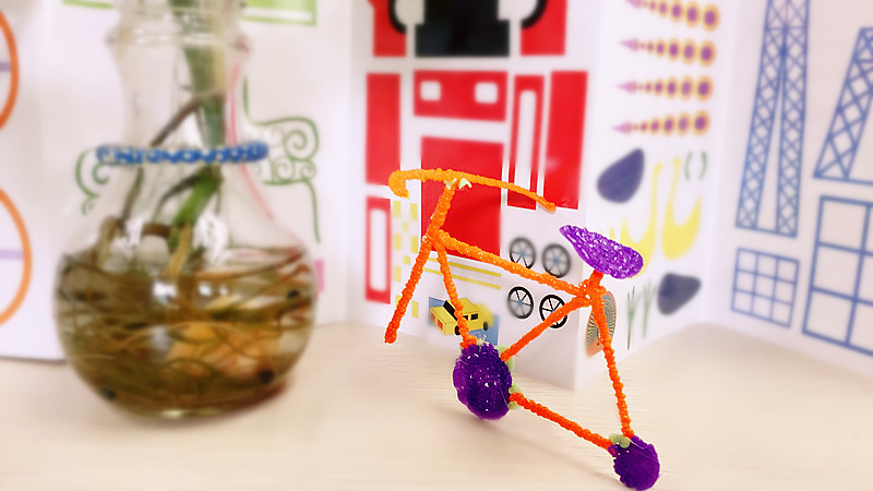 飛揚(yáng)選擇制作一輛自行車作品來初體驗(yàn)。按照畫冊圖案規(guī)格制作好各個部件,首秀作品在轉(zhuǎn)折畫筆時不是很平滑,致使整體線條看起來不是很平整統(tǒng)一,不過自我感覺良好,多練習(xí)就會收放自如了。顏色搭配完全由自己決定,不用拘束于畫冊的展示。制作過程中不可能一次性就畫好一幅作品,線條拼接時用筆頭的溫度熱一下拼接點(diǎn)再出料繼續(xù)制作,這樣兩個拼接點(diǎn)就會融在一起不斷裂。
