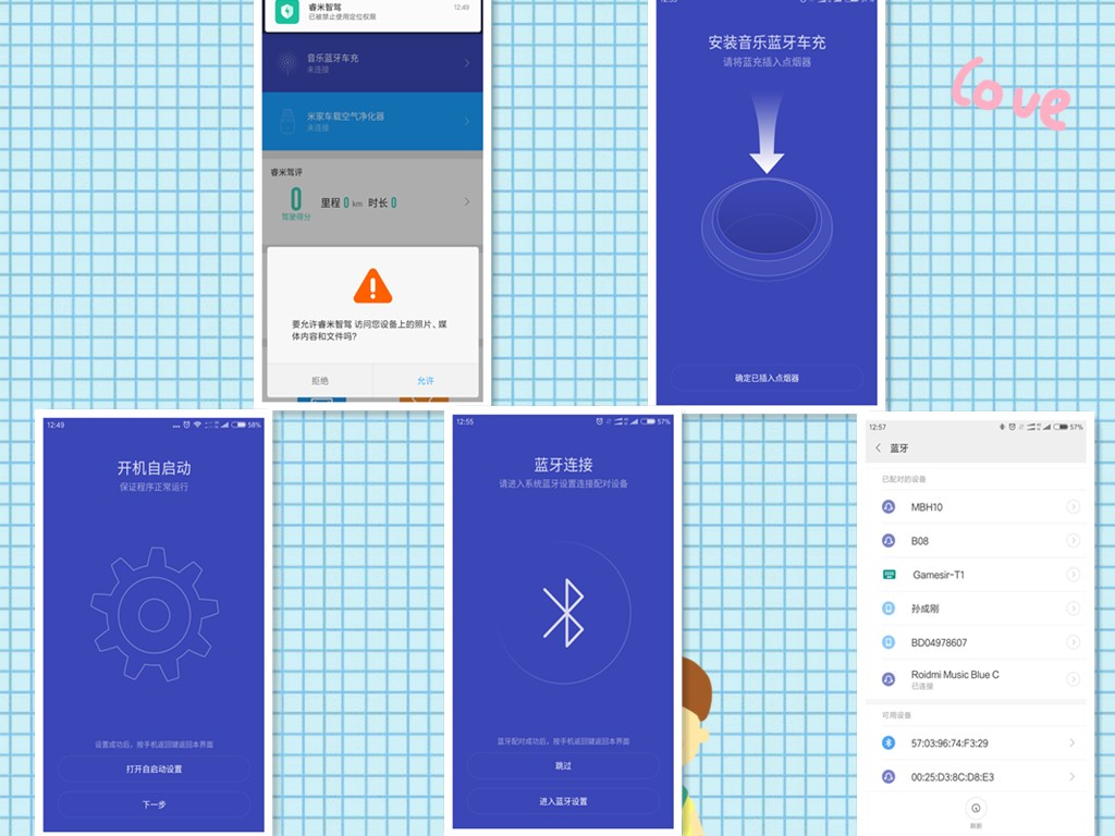 賬號注冊成功后,開始體驗睿米車充的軟件服務(wù),軟件里會有提示請將藍牙插入點煙器(將車充插入點煙器后會有藍色燈光顯示,在后面小編會介紹燈光怎么更改顏色),然后提示進入藍牙設(shè)置界面,與車充進行匹配,打開手機藍牙,會搜索到Rodmi Music Blue點擊進行匹配,匹配成功后即可正式體驗軟件端的服務(wù);