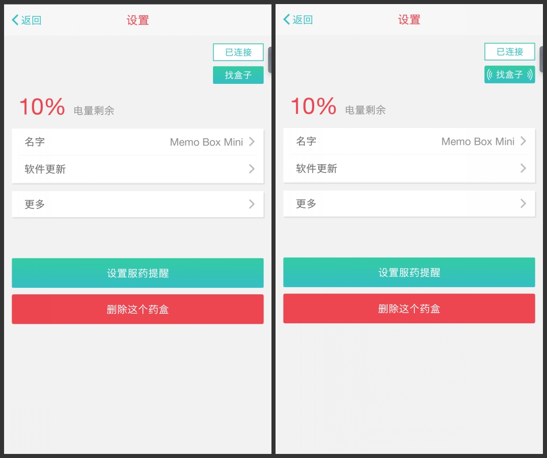 一旦到了預(yù)設(shè)的服藥時間提醒,手機(jī)會有提醒界面彈出并伴有鈴聲,而智能藥盒上則會有LED燈閃爍并伴有蜂鳴聲,“強(qiáng)制”“負(fù)責(zé)”的要求你服藥。還有一個很貼心很實用的功能,那便是尋找藥盒。也就是在突然找不到藥盒的時候,打開APP-設(shè)置-找盒子,這時候我們的智能藥盒便會“響應(yīng)”,讓使用者不至于丟失藥盒。