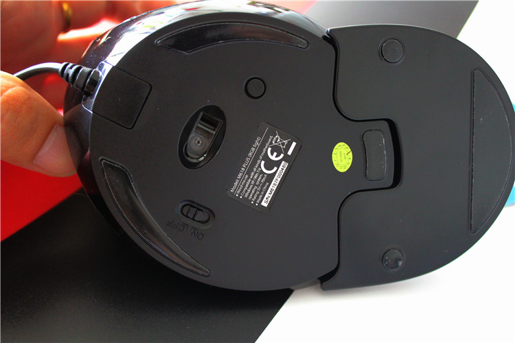 我們先從這款多彩立體垂直鼠標(biāo)的底部看一下,底部有六處防滑腳墊,一個DPI調(diào)節(jié)鍵可以一鍵調(diào)整鼠標(biāo)光標(biāo)在電腦上的運(yùn)行速度,另外還有一個流光燈的開關(guān)鍵。