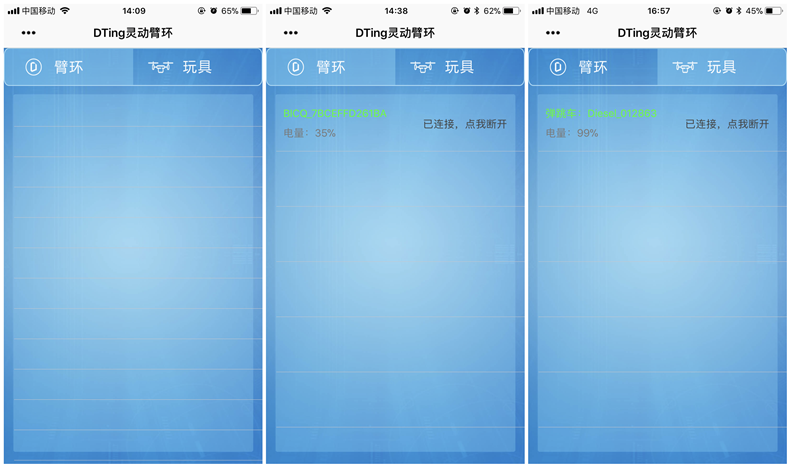 下載完APP后就可以看到界面上方會顯示兩項(xiàng)臂環(huán)和玩具,連接前需要在左上方選擇使用者年齡段,選擇玩后將靈動臂環(huán)連接usb線,顯示藍(lán)色燈光后說明以及連接在app內(nèi)也會顯出連接成功,包括靈動臂環(huán)的電量剩余顯示。