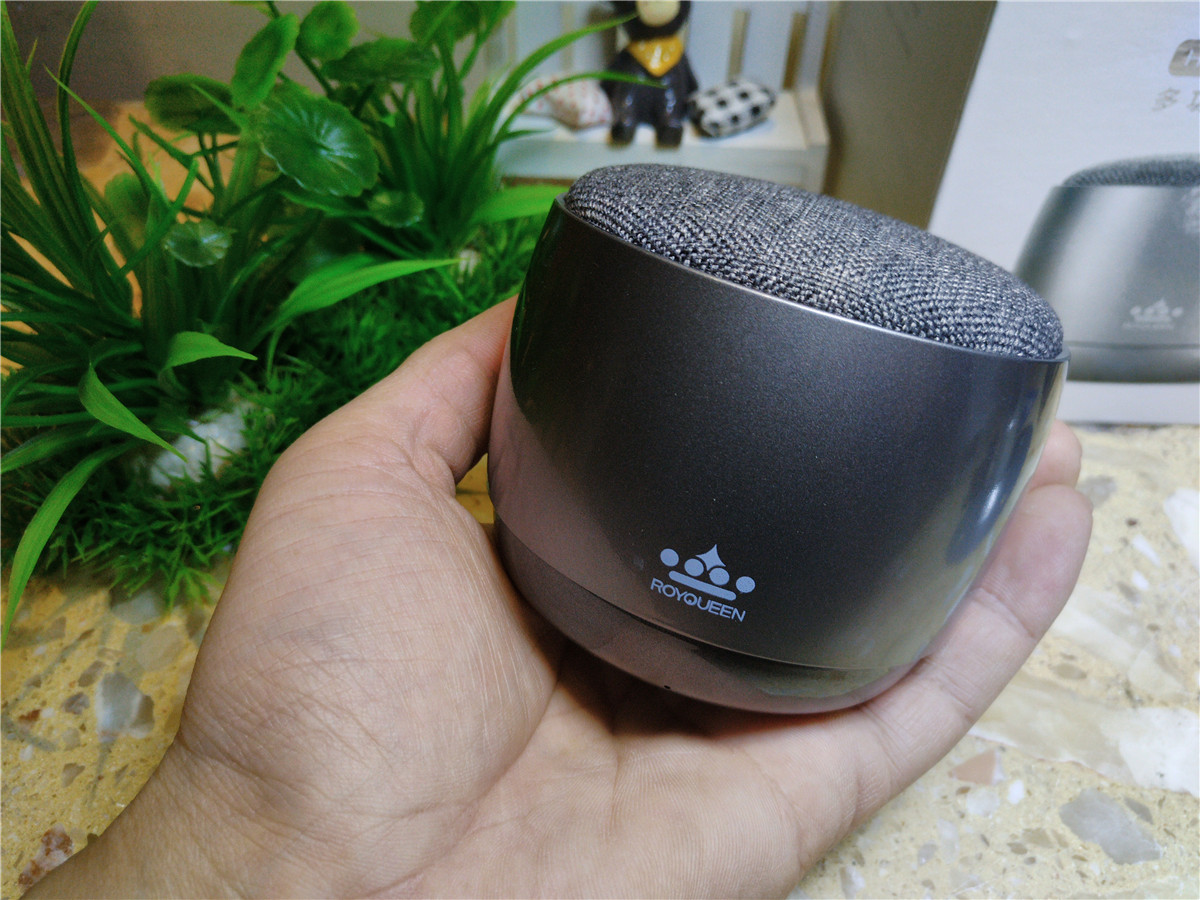 朗琴H601藍牙音箱整機三圍尺寸為直徑88mm,高度74.3mm。單手就可以握持,整機握在手上很有份量感。機身上方同樣印有ROYQUEEN品牌標志。