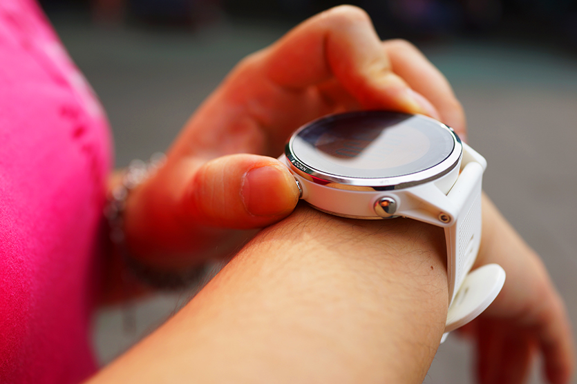 同很多智能手表一樣,充電觸電及心率監(jiān)測(cè)裝置都在表盤的背面。它內(nèi)置的是飛利浦動(dòng)態(tài)光學(xué)心率裝置,可以實(shí)現(xiàn)腕式實(shí)時(shí)監(jiān)測(cè)心率。從側(cè)面看這個(gè)心率監(jiān)測(cè)裝置稍有凸起,不過佩戴時(shí)并不影響手感。