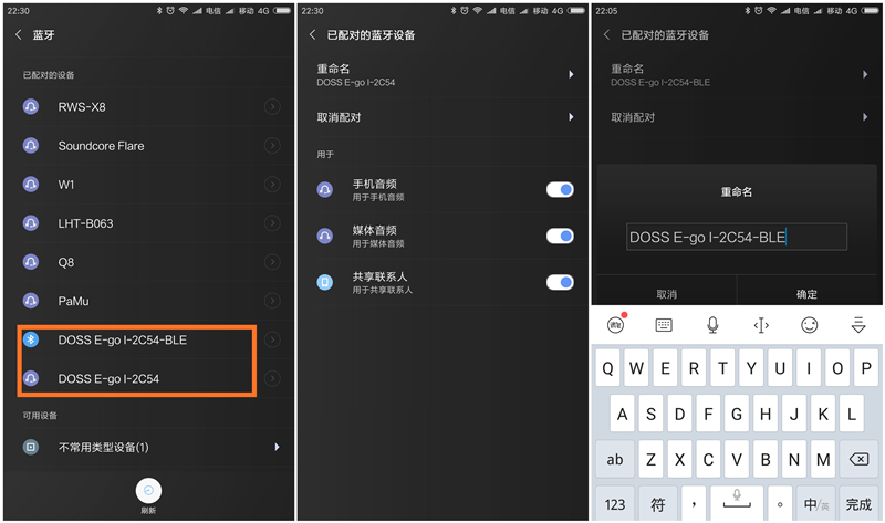 DOSS超級藍(lán)牙音箱,顧名思義是依靠藍(lán)牙作為連接方式的。通過藍(lán)牙比對可以看到有兩個(gè)藍(lán)牙連接。分別對應(yīng)音箱和語音交互。