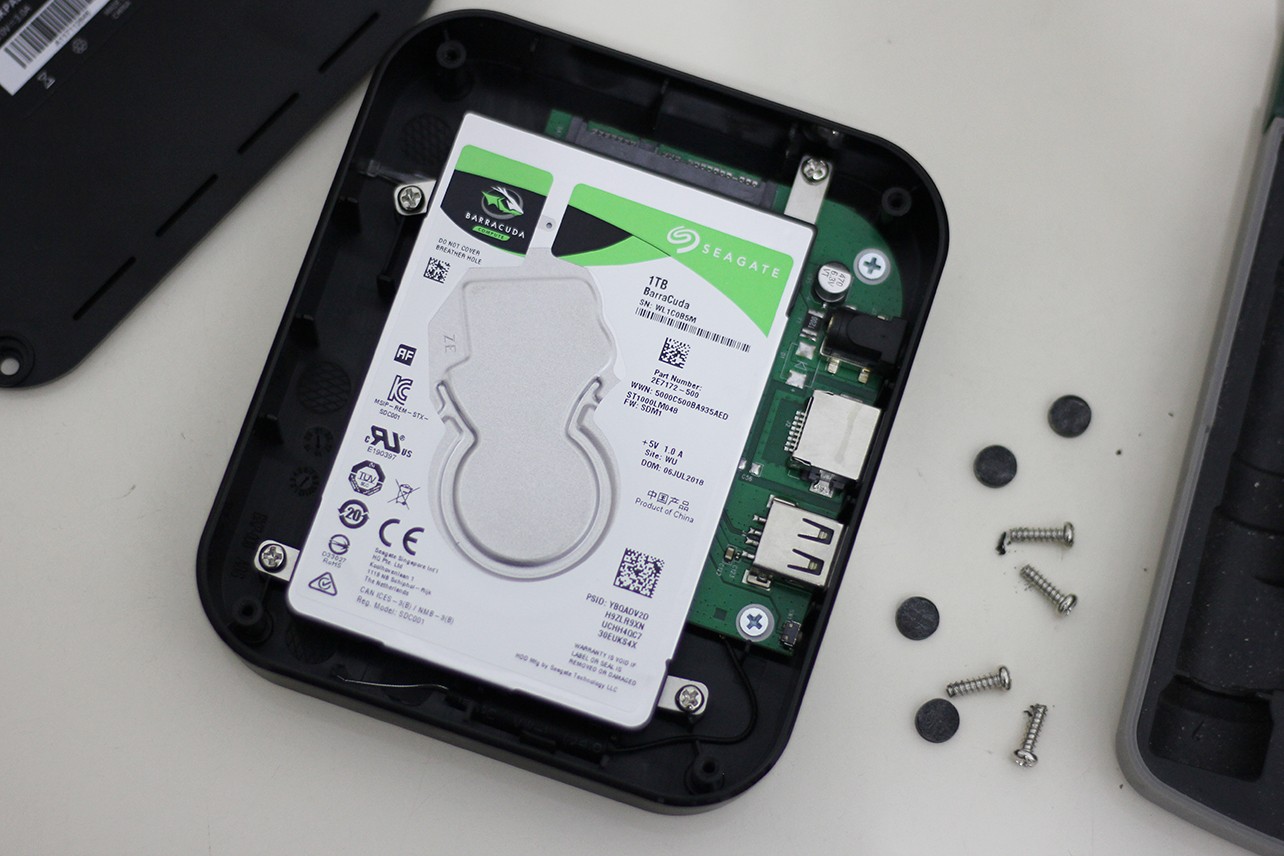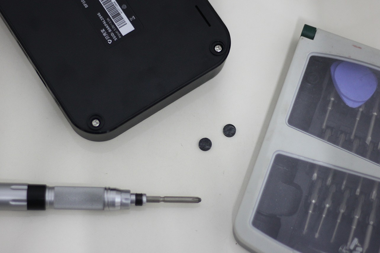 為數(shù)據(jù)備份,肯定涉及到硬盤容量的DIY,增加或減少硬盤容量這個(gè)看個(gè)人需求,有一些動(dòng)手能力再容易不過了,底部四個(gè)減震墊摳掉就可以看到四個(gè)螺絲。