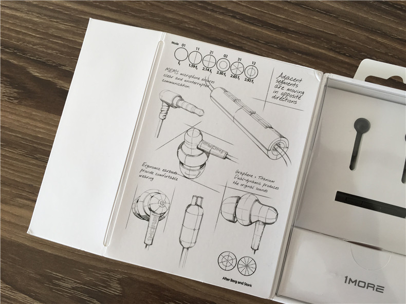 在包裝盒內(nèi)側(cè)沿用了1MORE的一貫式設(shè)計,即盒子內(nèi)側(cè)頂部印有耳機(jī)設(shè)計素描勾勒圖,可能作為一個小白用戶看不出里面的文章,但是整體設(shè)計給人的感覺是極好的,能夠更好的了解耳機(jī)設(shè)計初期的基于美學(xué)的考究。