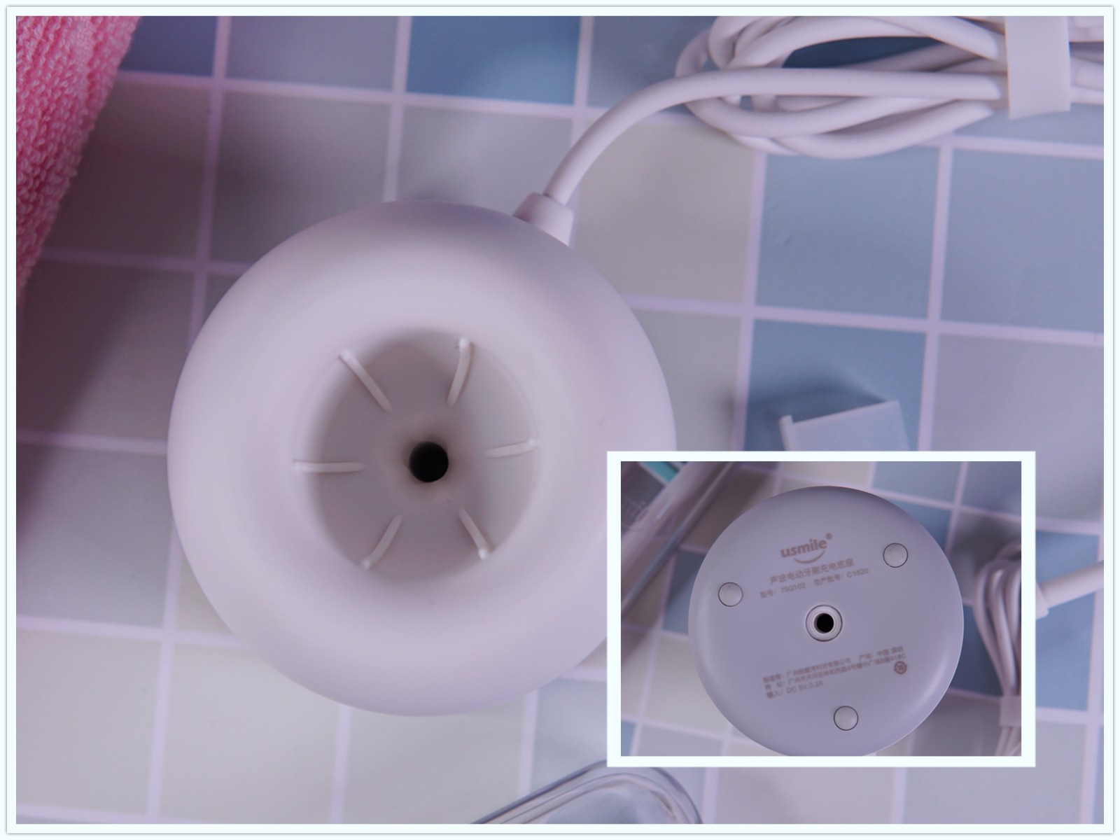 usmile冰淇淋聲波電動牙刷采用感應(yīng)式無線充電底座,雖然沒有充電頭,對于這一點,我覺得完全不是問題,因為需要使用手機的充電頭或者充電寶都可以為它充電。