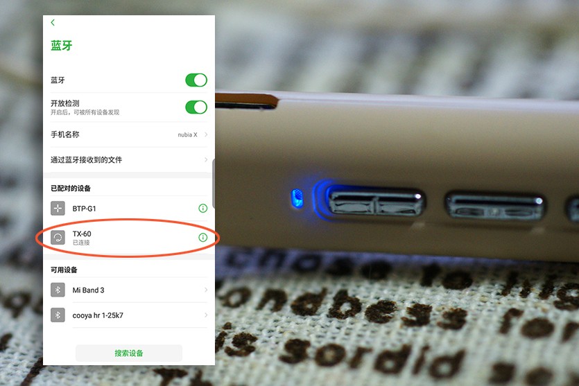 耳機(jī)開(kāi)機(jī)時(shí)長(zhǎng)按線控模塊中間的按鈕,由于按鍵是突出的,即使不用眼看也能準(zhǔn)確感知位置。第一次開(kāi)機(jī)后,指示燈會(huì)快速閃爍,表示正在等待設(shè)備連接,這時(shí)打開(kāi)手機(jī)藍(lán)牙,直接便可以搜索到名為“TX-60”的設(shè)備,點(diǎn)擊即可連接,這款耳機(jī)和TX-90一樣,可以同時(shí)連接兩臺(tái)設(shè)備,所以對(duì)于我這樣同時(shí)兩部手機(jī)的人來(lái)說(shuō)非常方便。
