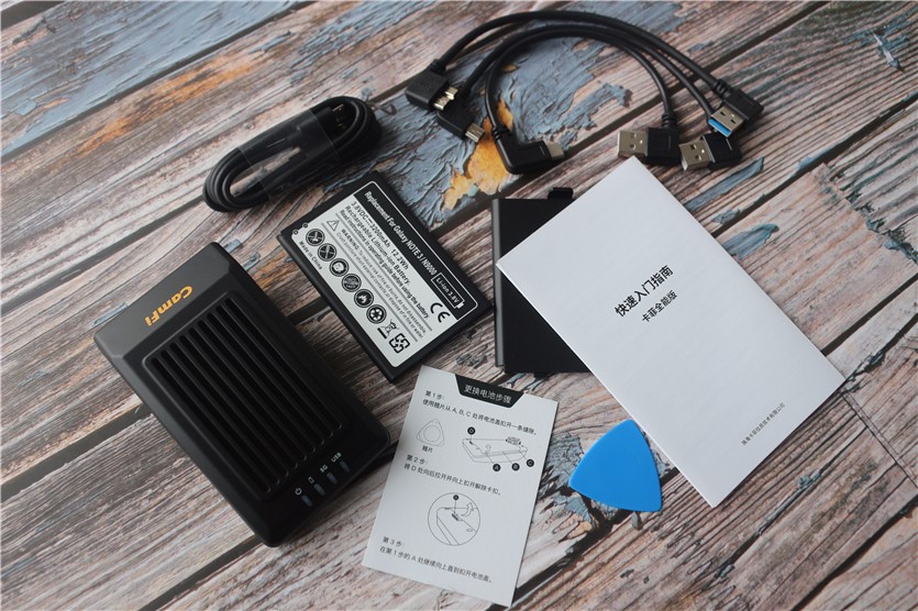 除了卡菲全能版Plus主機外,隨機配件包括Mini USB線(用于連接相機),USB3.0數(shù)據(jù)線(用于某系新型相機),USB type C數(shù)據(jù)線(用于Sony a7iii 和a7r iii)和Micro USB線(用于充電),快速入門指南以及一塊3200毫安鋰電池。