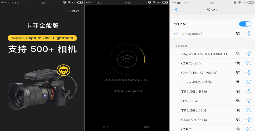 通過(guò)掃描快速入門指南上的二維碼,到達(dá)官網(wǎng)下載咖啡全能版的APP軟件,開(kāi)啟相機(jī)和卡菲全能版主機(jī)電源,掃描搜索連接至以“CamFi-Pro”開(kāi)頭的內(nèi)置Wi-Fi熱點(diǎn)上,就完成了控制器與手機(jī)的連接了。