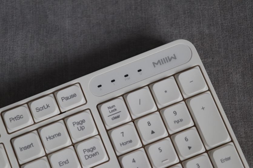 ▼米物鍵盤的右上角MIIW的logo很有趣,倒過來看也是MIIW。Logo左側(cè)的四顆led指示燈和常規(guī)鍵盤的不同:因為是無線鍵盤多了一塊電源指示燈(最右側(cè)那顆);因為PC/Mac雙模適配,多了雙模指示燈(右數(shù)第二個);第三個是NumLock,第四個是CapsLock。少了什么?少了我們不常用的ScrollLock指示燈,話說好多同學(xué)都不知道這個ScrollLock啥用吧?