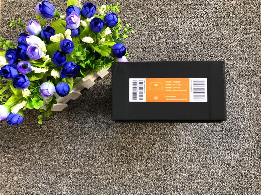 黑盒子的一個(gè)端部貼著標(biāo)簽,上面印著產(chǎn)品名稱、型號(hào)、電源規(guī)格、官方網(wǎng)址、出品方信息及三處條形碼。