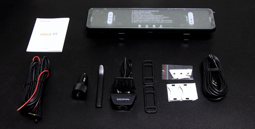 盯盯拍內(nèi)盒基本都是黑色配置,內(nèi)盒里裝著的是配件,作為一款前后雙攝的行車記錄儀,配件必須全面。盯盯拍E5全家福,12英寸屏幕的流媒體后視鏡,說明書,前置電源線,后置電源線,倒車影像線,點(diǎn)煙器USB插頭,后置攝像頭,綁帶,撬線棒,3M膠貼。這些配件基本組成了E5的安裝需求。
