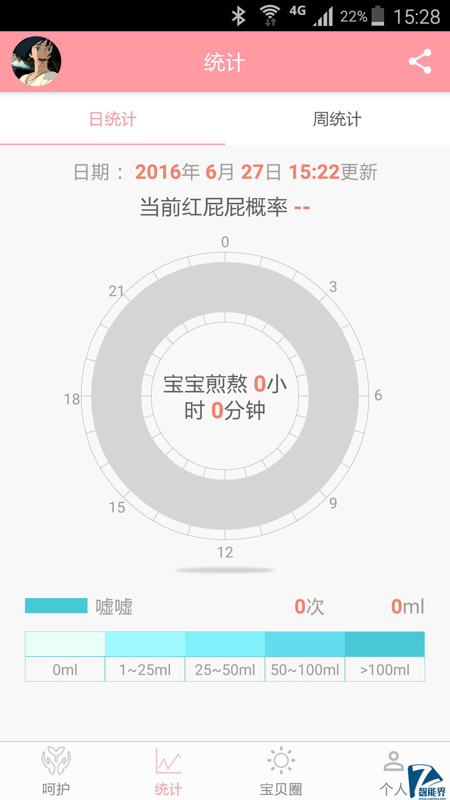 凡米小豆APP打開后,底部有四個選項,分別是呵護(hù)、統(tǒng)計、寶貝圈和個人。