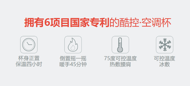 空調杯擁有7項國家專利,內(nèi)膽及輔材均采用進口嬰兒醫(yī)用級材質,藉由人體皮膚感溫及動脈傳溫的特性,并將空調可控溫度的特點加持在一支水杯上,利用杯體向人體皮膚及動脈導溫讓空調隨身攜帶變成可能。杯身正置可保溫4小時,倒置搖一搖則可開啟控溫模式,即熱敷、冰敷:開啟熱敷模式,搖一搖可控溫度,溫度從低到高,最高可達75度,用來緩解工作疲勞與緩解久坐引起的頸椎痛與緩解女性生理期的疼痛有奇效;開啟冰敷模式,對運動損傷冰敷,可降低組織創(chuàng)傷程度、加快組織修復。