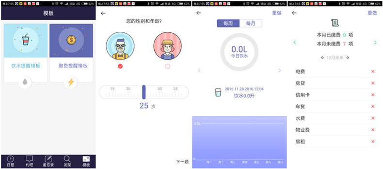 第五個是提醒模板,可以提醒你喝水和平時(shí)的電費(fèi)、水費(fèi)、信用卡、房租的繳費(fèi)日期。喝水提醒,首先設(shè)置好性別、年齡、身高體重就可以設(shè)置提醒了。感覺還也挺好的。