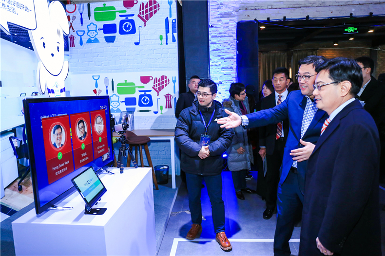凱德集團中國區(qū)首席執(zhí)行官羅臻毓為新加坡財政部部長王瑞杰介紹凱德星數(shù)字化平臺