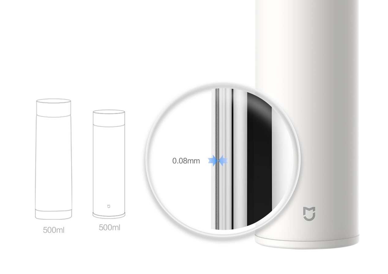 米家推出的保溫杯的杯底采用薄底激光焊接工藝,比傳統(tǒng)的杯底薄10mm,提升了2倍的保溫性能,在同等容量下,比傳統(tǒng)保溫杯輕約70g。保溫內(nèi)膽采用三軸高速旋薄工藝,讓內(nèi)膽的壁厚只有0.08mm,比一般保溫杯0.20mm的厚度大大減少。采用這個工藝,可以提高保溫性能,同時提升杯子的實際容量。