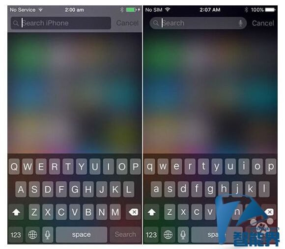 當(dāng)你在主屏界面下拉呼出Spotlight 的時候,你會發(fā)現(xiàn)iOS 9 的搜索框變成了圓角設(shè)計,還增加了語音聽寫的標(biāo)識。