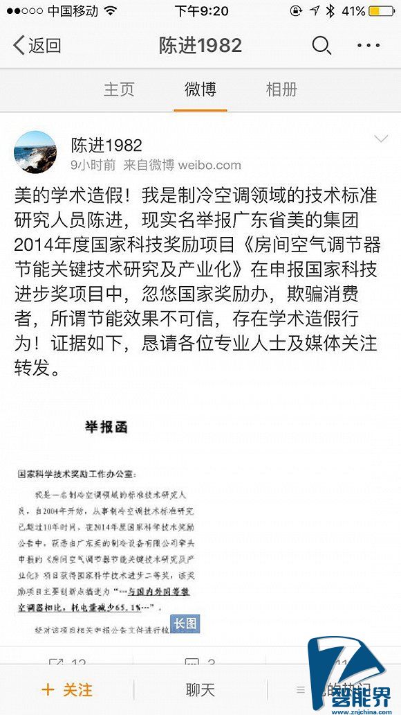 其微博正文內(nèi)容為:“美的學(xué)術(shù)造假!我是制冷空調(diào)領(lǐng)域的技術(shù)標(biāo)準(zhǔn)研究人員陳進(jìn),現(xiàn)實(shí)名舉報(bào)廣東省美的" />
